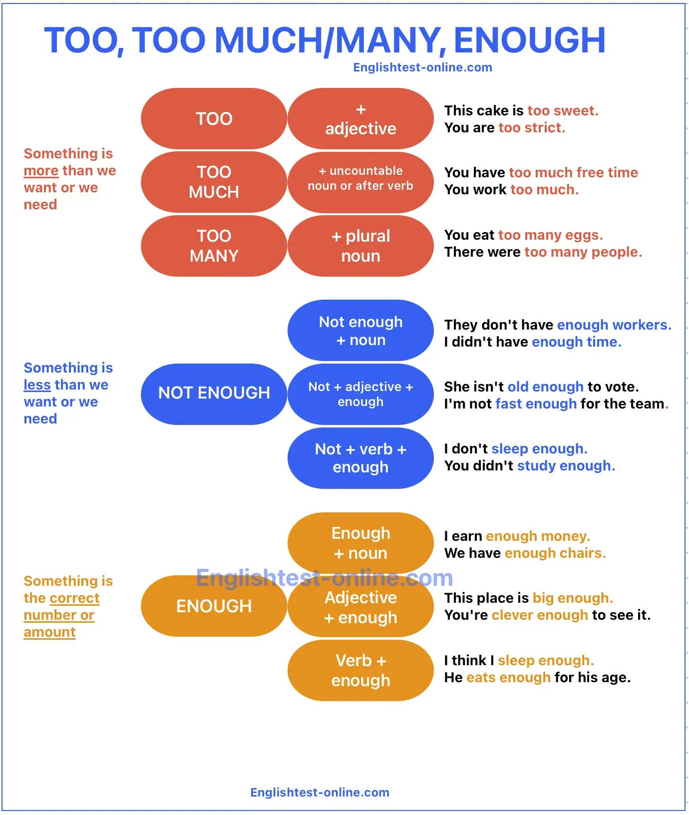 | Enough | Before noun / After adjective | The right amount | She isn’t tall enough. |